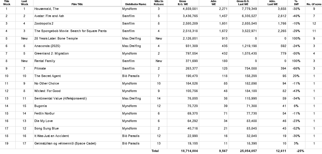 Spennutryllirinn The Housemaid, eða Húshjálpin, í lauslegri íslenskri snörun, með Sydney Sweeney og Amöndu Seyfried í aðalhlutverkum, situr áfram á toppi íslenska bíóaðsóknarlistans eftir þrjár vikur í sýningum. Tekjur myndarinnar um síðustu helgi námu nærri fimm milljónum króna og heildartalan er komin í 36 milljónir.